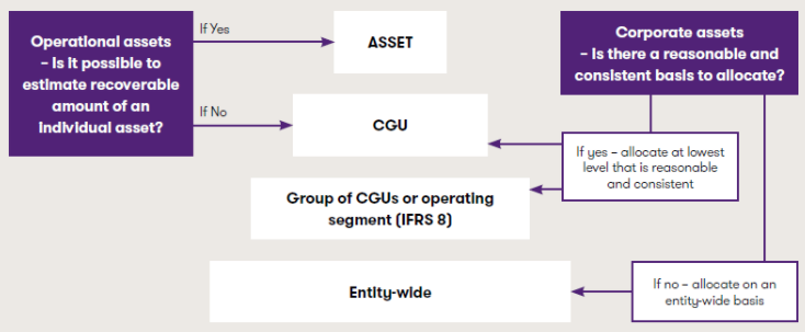 As discussed in our previous article, recoverable amount is determined (if required) at the level of individual assets when possible. Where it is not possible to estimate the recoverable amount of the individual operational asset it is allocated to the CGU to which it belongs.