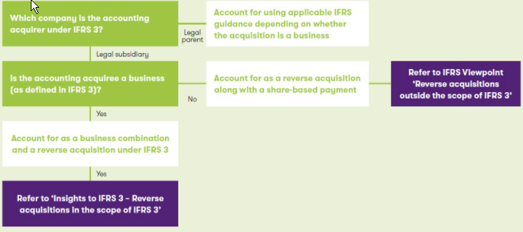 The following diagram illustrates the two possible accounting treatments, with reference to the relevant publications, when facing a reverse acquisition: