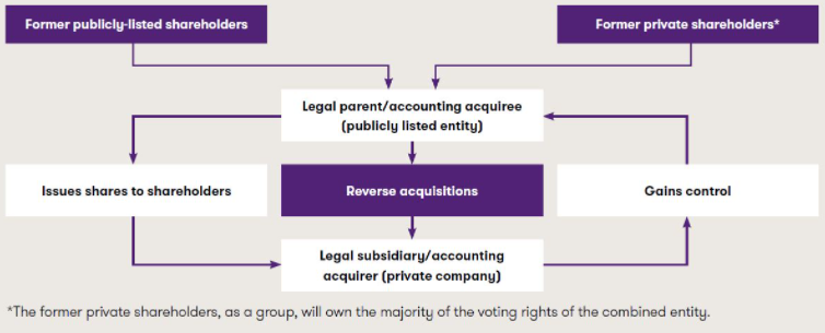 One situation in which reverse acquisitions often arise is when a private operating entity wants a fast-track to a public listing. To accomplish this, the private entity arranges for its equity interests to be acquired by a smaller, publicly listed entity. The listed entity carries out the acquisition by issuing shares to the shareholders of the private operating entity. After the exchange of shares, the former shareholders of the private entity, as a group, hold the majority of the voting rights of the combined entity. In addition, the former shareholders of the private entity then appoint the majority of the members of the new combined entity’s board. In this case, although the publicly listed entity issued shares to acquire the private entity, the listed entity will be identified as the accounting acquiree and the private entity as the accounting acquirer as the former shareholders of the private entity, as a group, have obtained the control over the combined entity.