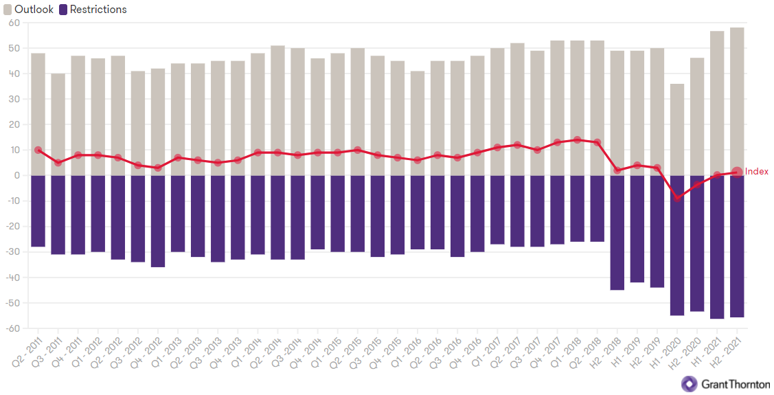 Grant Thornton’s index is composed of two elements: the outlook shows the growth expectations of the mid-market and the restrictions reveals the barriers to growth. The pattern over 10 years’ of data is that both of these tend to move in a similar direction. When the barriers to growth improve so too do the growth expectations, and vice versa.