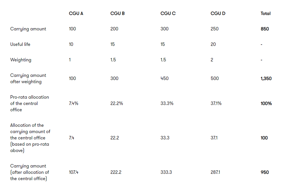 Although not the only way to do so, Entity E allocates the carrying amount of the central office to the carrying amount of each individual CGU using a weighted allocation basis because the estimated remaining useful life of A’s CGU is 10 years, whereas the estimated remaining useful lives of B and C’s CGUs are 15 years and D’s CGU is 20 years.