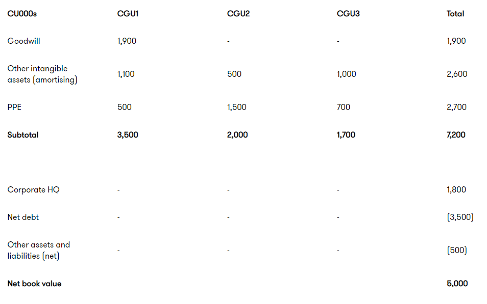 - whether some or all of the shortfall is attributable to assets and liabilities outside IAS 36’s scope (eg if the fair value of the entity’s net debt is significantly different to its carrying value of CU3,500)