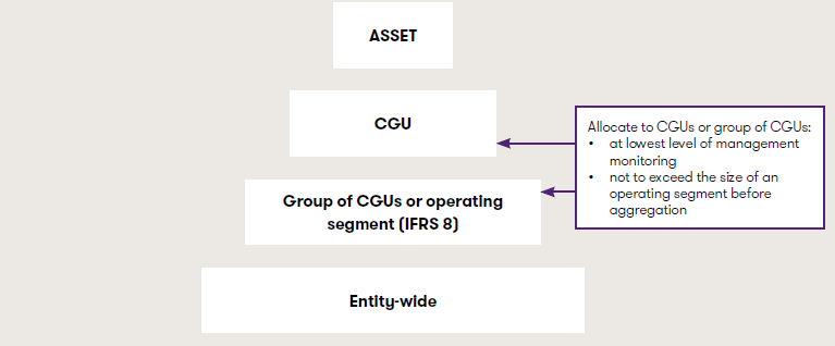 After the entity identifies its CGUs, it must determine which assets belong to which CGUs, or groups of CGUs. The basis of allocation differs for: