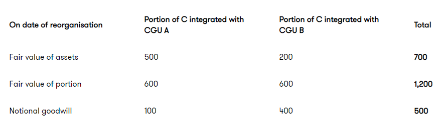 For example, assume an entity reorganises from three to two CGUs and the assets and activities of the third CGU (CGU C) are integrated with the remaining two (CGUs A and B). CGU C includes allocated goodwill of CU300 which must now be reallocated to CGUs A and B. Under the benchmark approach the reallocation would be based on the relative values of the portions of CGU C that are integrated into CGUs A and B. However, assume also that the portion of CGU C integrated with CGU A is a manufacturing operation and the portion integrated with CGU B is a service-based operation. Using the figures in the table below, the relative value basis would result in the allocation of CU150 to CGU A and CU150 to CGU B. The entity may deem it more appropriate in this case (given the different nature of the activities integrated into CGUs A and B) to allocate goodwill based on the notional goodwill of each portion resulting in an allocation of CU60 to CGU A (100/500*300) and CU240 to CGU B (400/500*300).