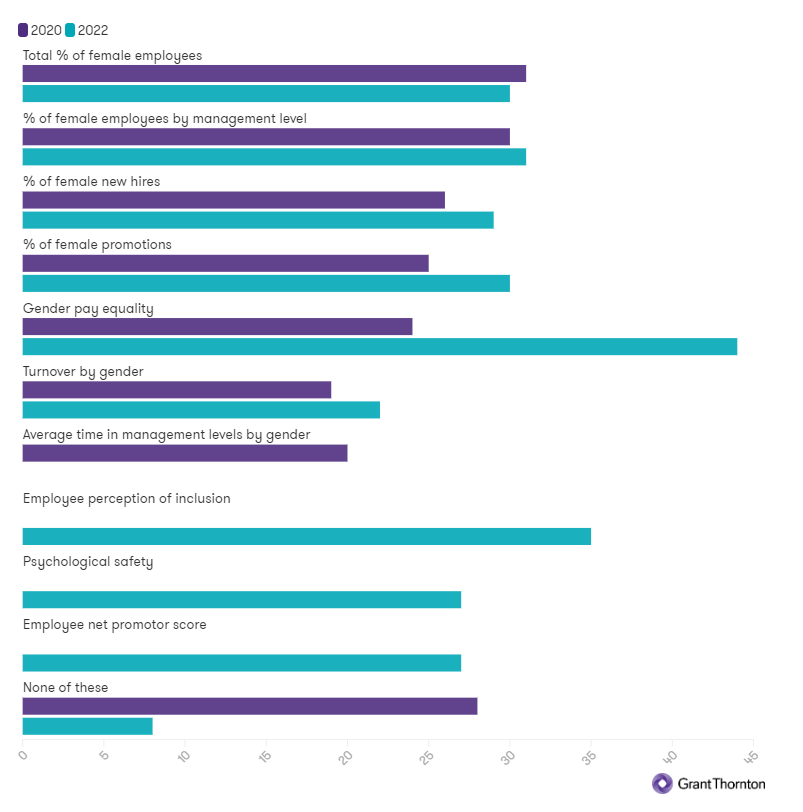 In 2022, we see significant numbers of businesses recording wider metrics around inclusion, such as employee perception of inclusion (35%), psychological safety (27%), and employee net promotor score (27%). While these were not metrics that featured in the 2020 research, it’s safe to assume that employee opinion-oriented research has increased among companies looking to understand their D&I position.