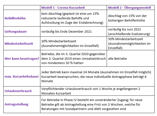 Betriebe, die nach wie vor von den Einschränkungen der COVID-Maßnahmen maßgeblich in Mitleidenschaft gezogen werden, sollen vom Instrument der Kurzarbeit weiterhin Gebrauch machen können. Anders als in den Vorperioden wurden zwei verschiedene Modelle ausgearbeitet, die von Unternehmen, deren finanzielle Leistungsfähigkeit durch die Corona-Krise beeinträchtigt ist, in Anspruch genommen werden können.