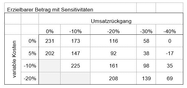 - Zur Veranschaulichung, welche Auswirkung Parameterabweichungen auf den erzielbaren Betrag haben, empfiehlt sich Sensitivitätsanalysen für wesentliche Werttreiber zu ergänzen. Beispielhaft bietet folgende Darstellung eine gute Übersicht über die Auswirkungen von Parameter-Änderungen:
