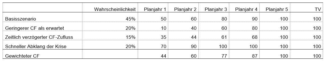 Die Szenarien geben die Einschätzung des Managements über die Entwicklung der Krise bezüglich der Intensität und der Dauer wieder. Die Gewichtung der Eintrittswahrscheinlichkeiten verlangt nach einer überlegten Gesamtbetrachtung, um zu optimistische oder pessimistische Ergebnisse zu vermeiden.