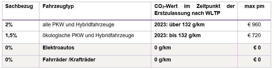 - Für die Privatnutzung eines Firmen-PKW sind basierend auf den CO2-Emissionswerten nach dem WLTP-Messverfahren bei Erstzulassung in 2023 folgende Sachbezugswerte anzusetzen: