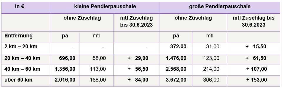 Der bei Anspruch auf das kleine oder große Pendlerpauschale zustehende Pendlereuro (von € 2 pro Jahr und Kilometer der einfachen Fahrtstrecke) erhöht sich von Mai 2022 bis Juni 2023 um € 0,50 pro Monat und Kilometer der einfachen Fahrtstrecke.