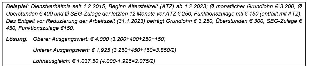 - Die Neuberechnung des Lohnausgleichs bei Altersteilzeit sieht vor, dass in den oberen Ausgangswert alles an Entgelt einzubeziehen ist, unabhängig davon, ob es während der Altersteilzeit weiter gebührt. Im Endergebnis bedeutet das weniger Lohnausgleich.